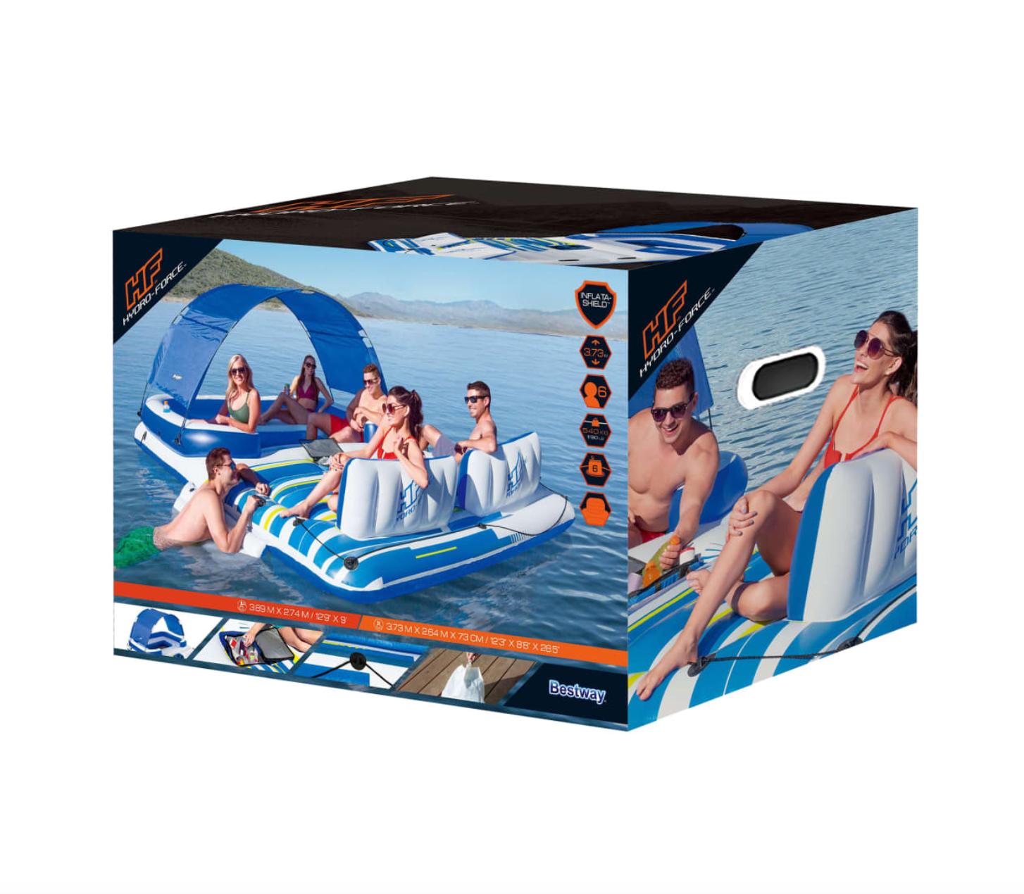 Cette île flottante cool est parfaite pour passer du temps entre amis en été. L'îlot flottant est doté de dossiers extra larges et de 6 porte-gobelets intégrés. Un sac isotherme est également inclus qui peut garder les boissons froides et à portée de main. Aux deux extrémités se trouvent des guides et des poignées solides sur la plate-forme. Un auvent amovible est également inclus pour fournir de l'ombre et protéger des rayons du soleil.