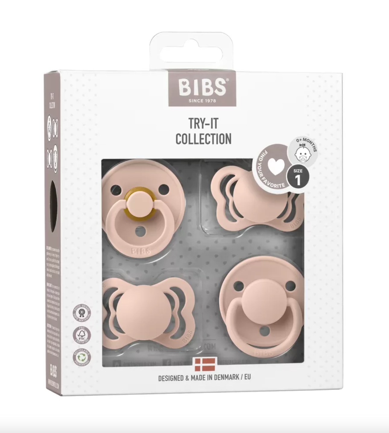 Ce paquet intelligent de smække vous permettra, en tant que parent, de déterminer beaucoup plus facilement quelles sucettes conviennent à votre enfant. Avec cette collection Try-It, vous obtenez une tétine des 4 catégories différentes de BIB. Il y aura une sélection de toutes les tailles de poitrine (rondes, symétriques et anatomiques) et de matériaux (caoutchouc naturel, latex et silicone) de BIB.