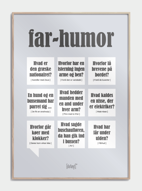 le dialogue a été extrêmement créatif lorsque vous avez choisi ces blagues que vous retrouverez sur Faderen Humo Pillish, pp. Vous aurez donc peut-être la chance que cette affiche puisse inciter votre père à faire appel de temps en temps à une nouvelle entreprise de carton si vous en avez assez d'entendre tout le temps les mêmes blagues. Mais si votre père est au courant de la meilleure humeur en carton, vous serez probablement en mesure de reconnaître certaines des blagues qui figurent sur l'affiche Humora d'un père, P, et vous pourrez alors rire à nouveau pour l'une de ces blagues amusantes. des blagues. < /p>