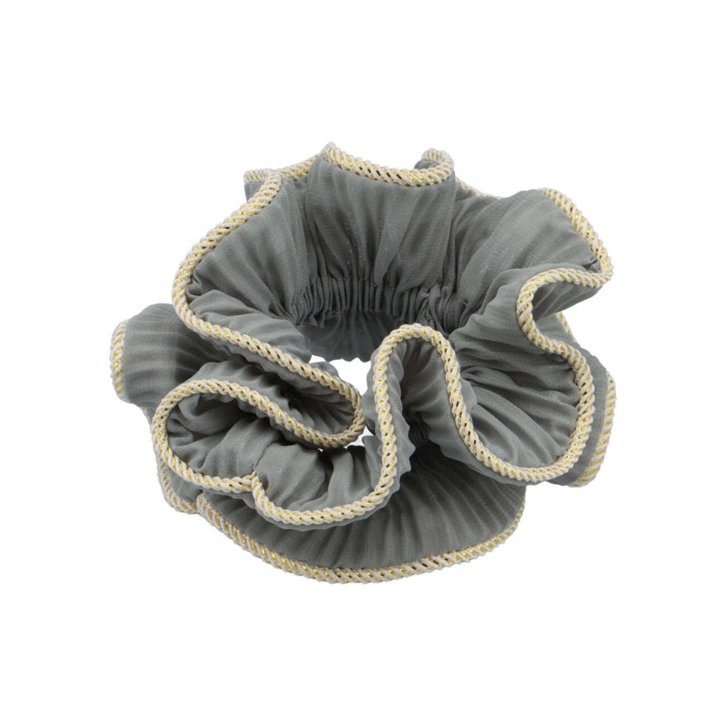 Le scrunch le plus unique que vous puissiez trouver. Il a la plus belle couleur grisâtre, un beau bord doré et une touche qui en fait un détail très joli pour la tenue. Ce chouchou peut être utilisé à tout âge et pour toutes les occasions. Il est fait du meilleur matériau en mousseline et possède un élastique de haute qualité.