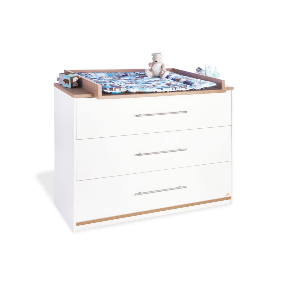 La gamme est un joli mélange d'aspect bois et de bois peint en blanc avec des poignées en métal.